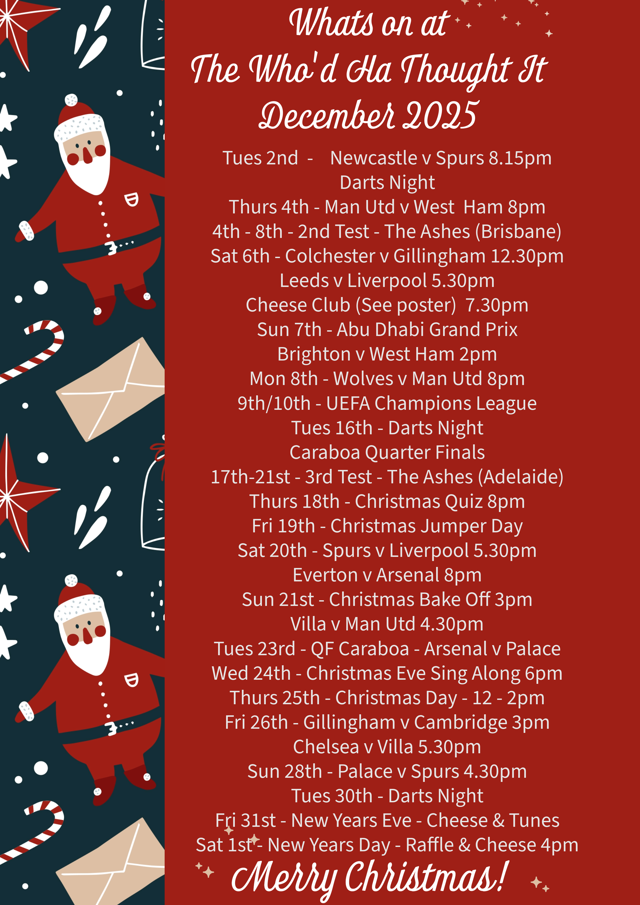 Every month we publish an event list with the dates of key sporting events plus a monthly quiz and any other events at the pub, whether it be charity walks, BBQ’s, Beer festivals, bake offs, curry nights, murder mystery, we even have an annual conker competition!